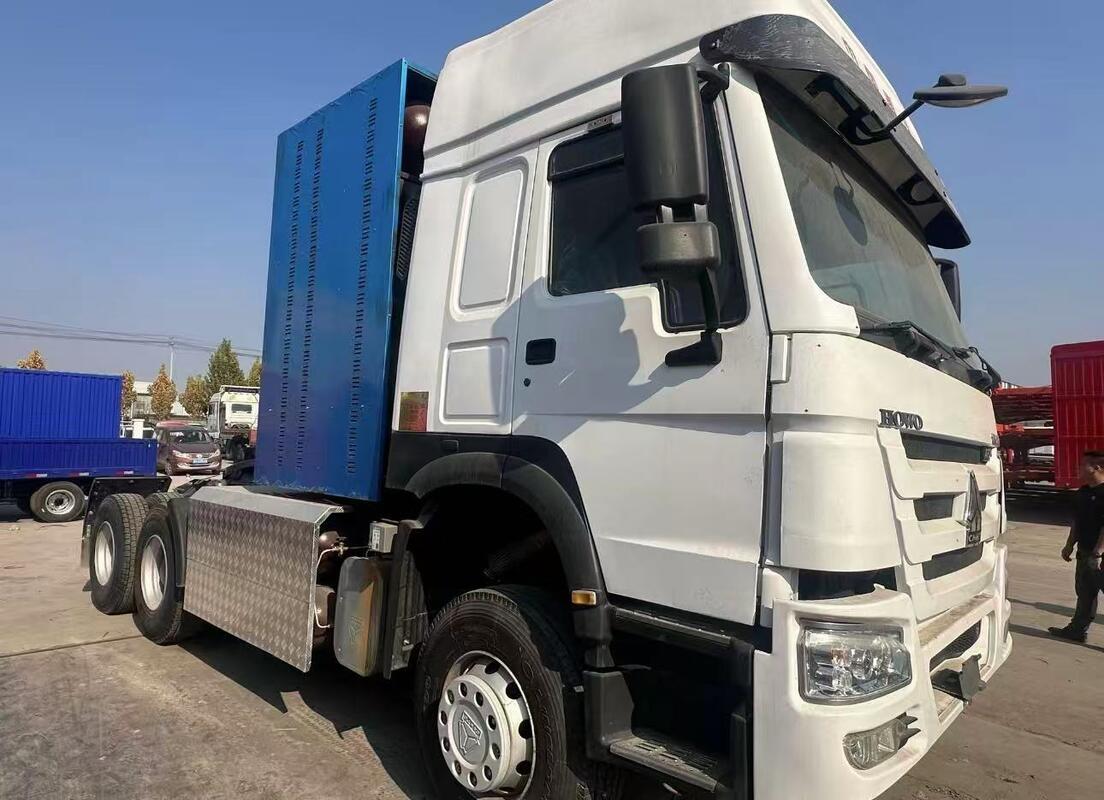 The chassis incorporates a MCX16ZG double rear axle with a gear ratio of 4.803, optimized for strong pulling power and fuel efficiency, along with a VGD95 drum-type front axle. It rolls on 315/80R22.5 tires and comes with one spare tire as standard. For trailer coupling, the truck is fitted with a 90# JOST fifth wheel, model JSK39DV1-35, engineered to handle heavy loads safely. The driver cabin is configured as an H77L long cabin with two seats and one sleeper berth, though it does not include factory air conditioning. With a rated loading capacity of 9,500 kg and a speed limit set at 60 km/h, this HOWO tractor is well-suited for medium- to long-haul logistics operations where emission compliance, operating cost savings, and dependable performance are key priorities.